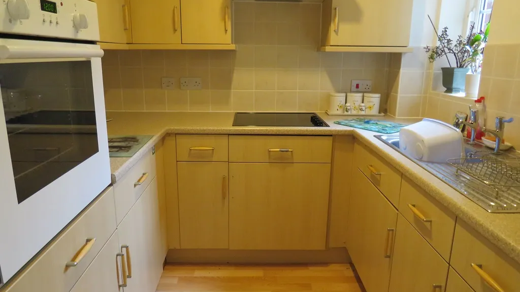 From the dining area is the kitchen which has a quality range of built-in storage cupboards, fitted sink drainer and under counter fitted fridge. There is a built in oven and hob and lovely views over the communal gardens.